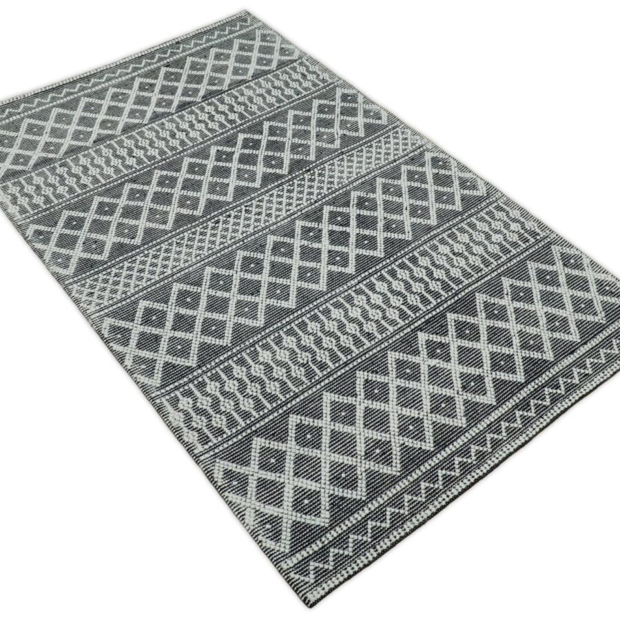 This unique Dhurrie is meticulously handwoven using a blend of Wool and art silk, showcasing intricate tribal designs employing the flatweave technique. The color palette of fresh Ivory and Gray hues along with tribal patterns infuses warmth into any room. Its lightweight and thin construction make it easy to move and clean the space.